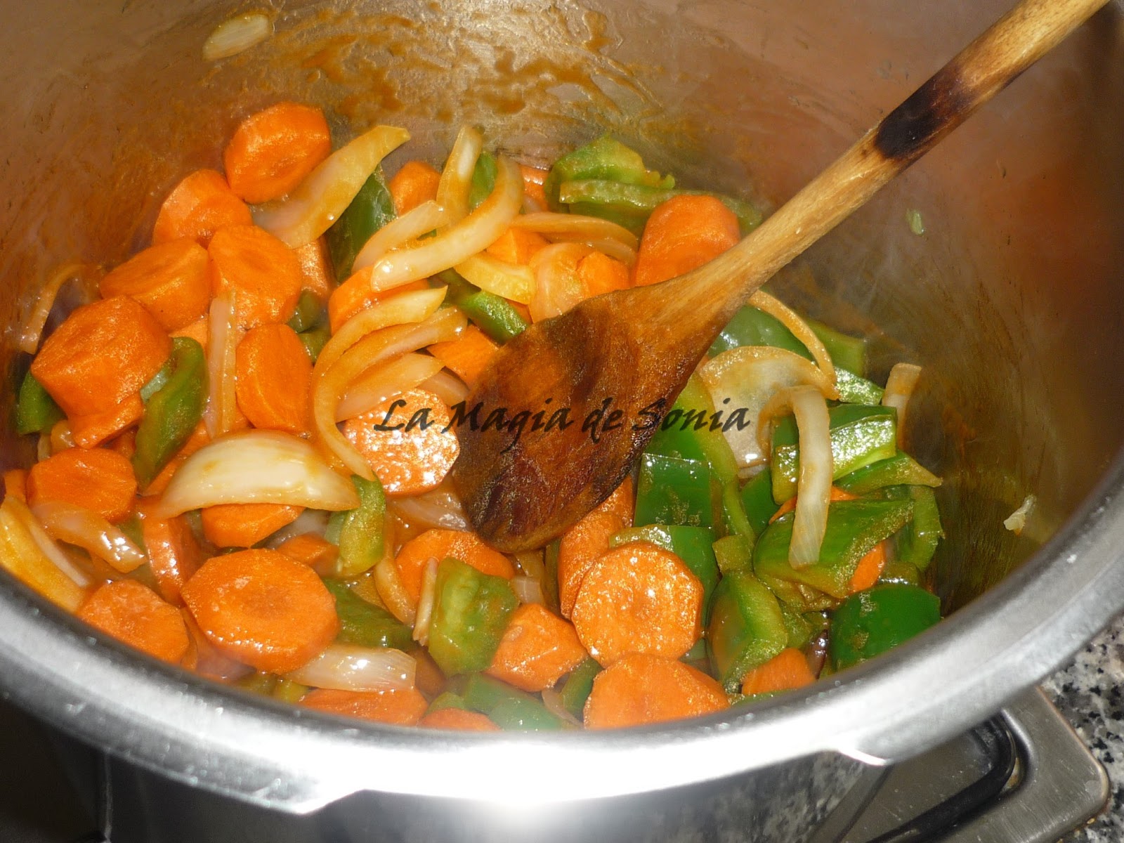 2. En el fondo de la olla express ponemos un pelín de aceite de oliva y pochamos el ajo, la cebolla y el pimiento verde con una pizca de sal...... una vez pochado agregamos las zanahorias y damos unas cuantas vueltas....