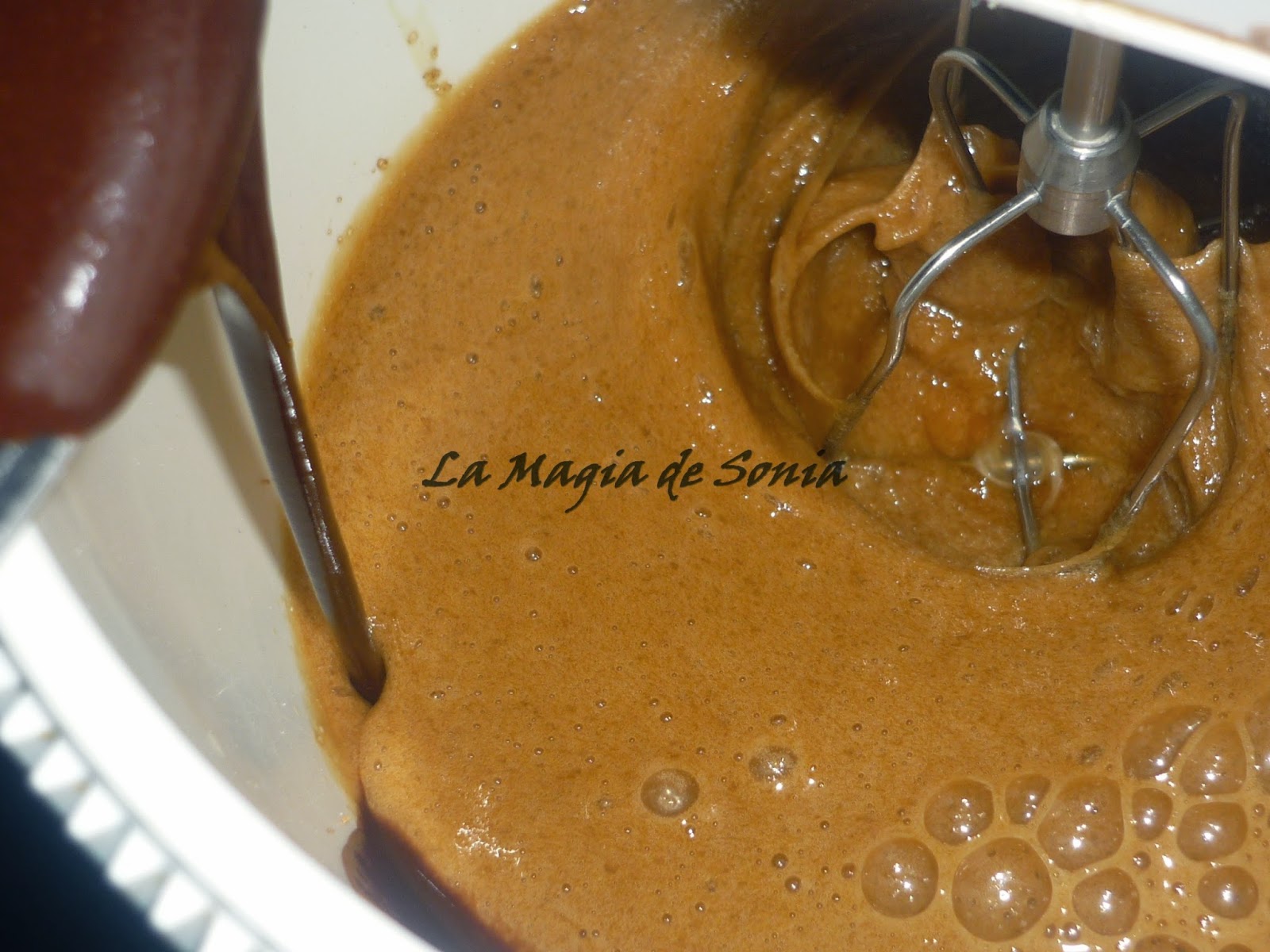 4. Vertemos el azúcar poco a poco desde el borde del bol sin dejar de batir para que no se baje....añadimos la mezcla chocolateada batimos (hacerle desde el borde del bol también) y ya luego pondremos la harina + cacao + sal. Batimos.